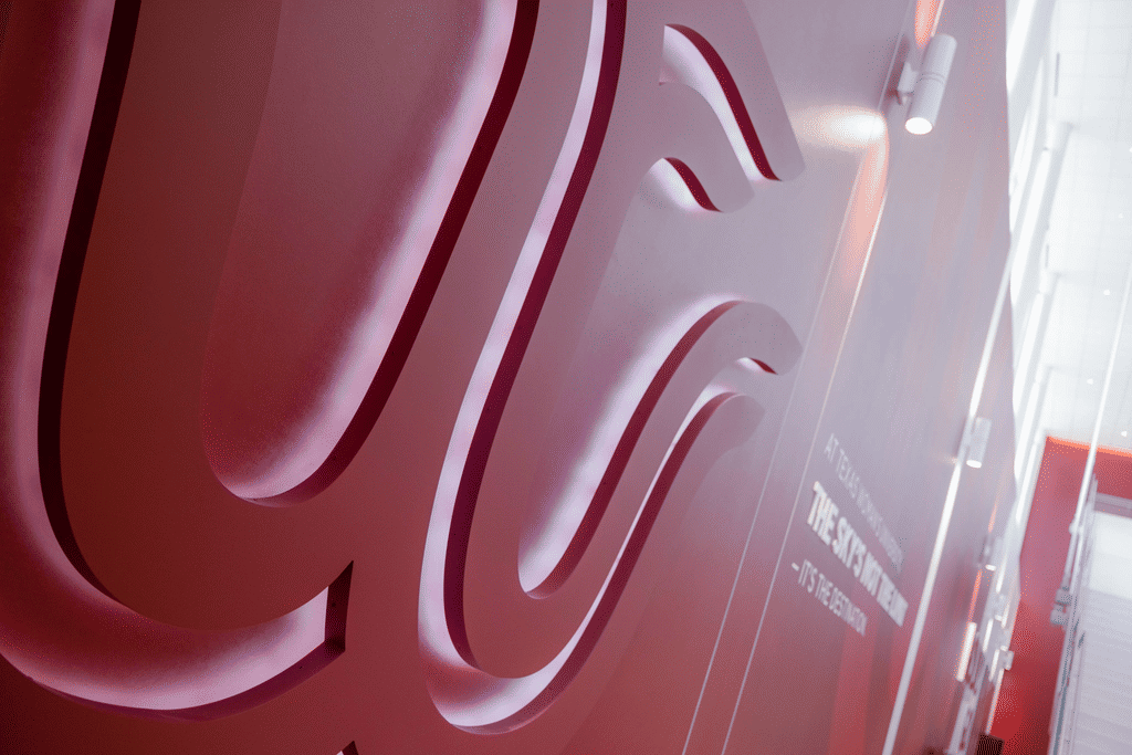 Maroon appears throughout the space as a unifying thread, reinforcing institutional identity while conveying warmth and approachability – the feeling of a “campus with a heart.” Walls function as storytelling surfaces that celebrate the well-rounded student experience and shared sense of purpose. Subtle references to emerging programs, including aviation, gesture toward the university’s future, while keeping the emphasis on people, place, and connection – and fully immersing visitors in what it means to be a Pioneer – the university’s symbol of leadership, progress, and possibility.